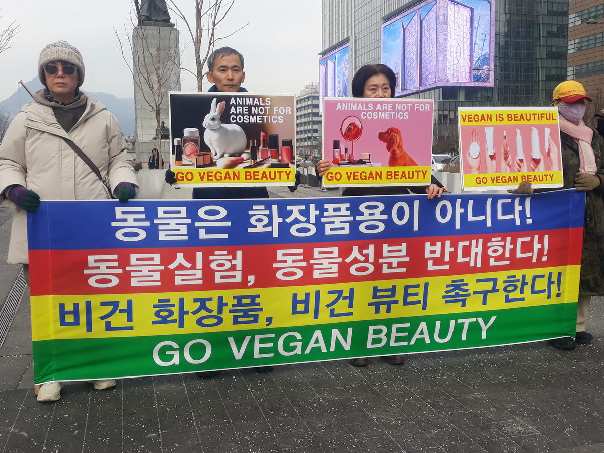 광화문 이순신동상 앞에서 열린 기자회견에서 참가자들이 비건 화장품과 비건 뷰티 확산을 촉구하는 문구가 적힌 피켓과 현수막을 함께 들고 퍼포먼스를 진행하고 있다. 이 기자회견은 한국동물보호연합, 한국비건채식협회, 기후위기비건행동, 한국비건연대, 한국채식연합이 공동으로 마련했다.
