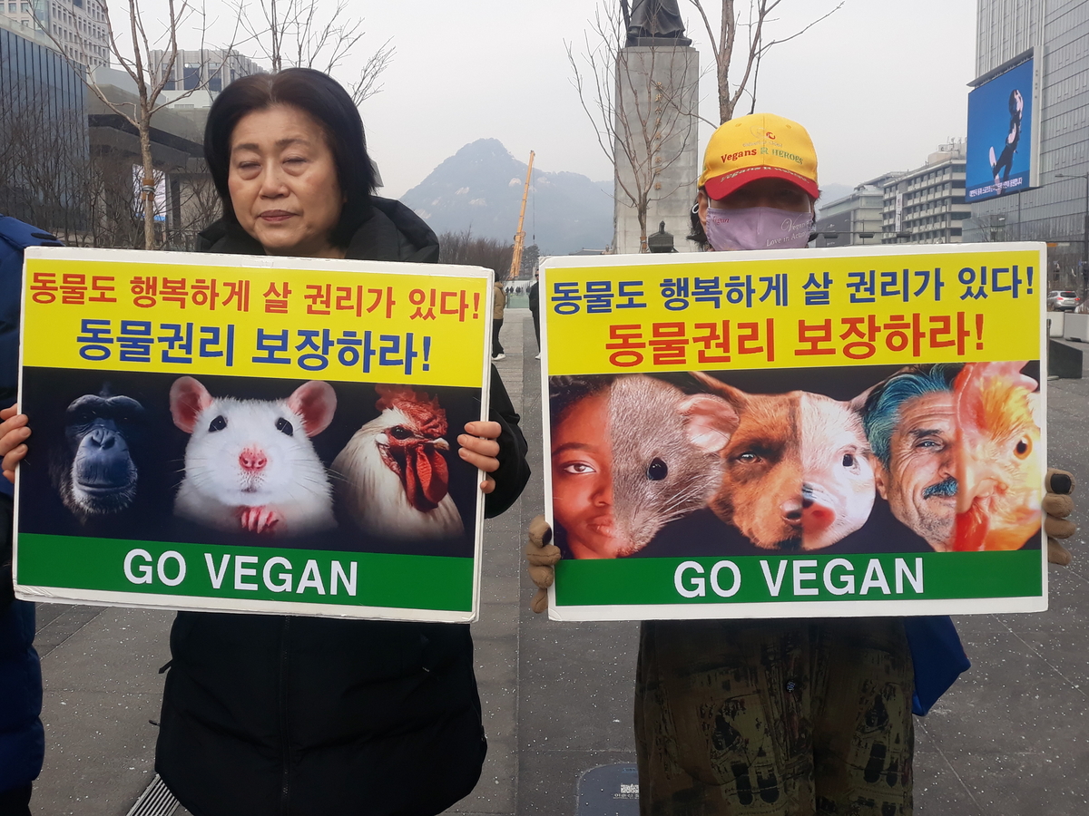 [비건뉴스] 한국동물보호연합은 지난 10일 오후 서울 광화문 이순신동상 앞에서 동물권리 보장과 동물해방, 비건채식 촉구를 위한 기자회견을 열었다.