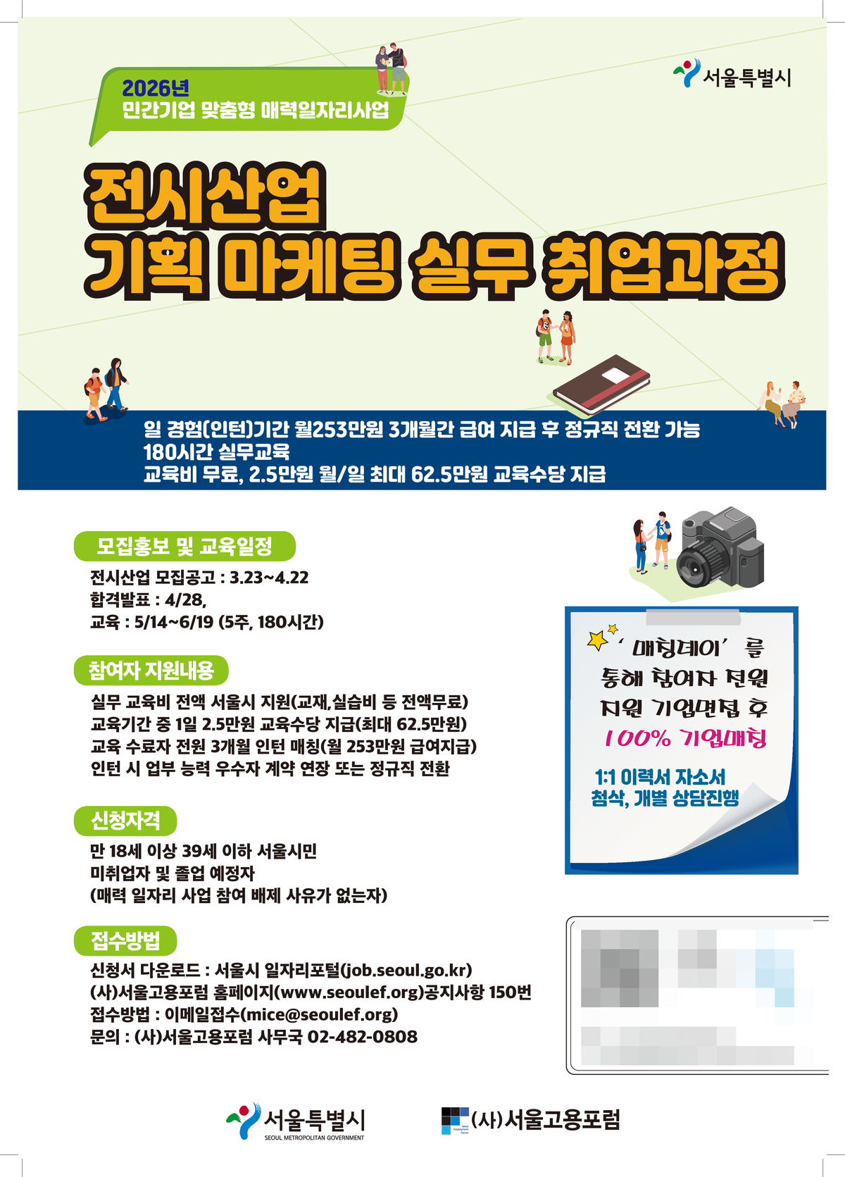 서울특별시와 서울고용포럼은 전시산업 분야 취업을 희망하는 청년을 대상으로 한 ‘2026년 서울매력일자리’ 교육 과정 참가자를 모집한다고 30일 밝혔다.