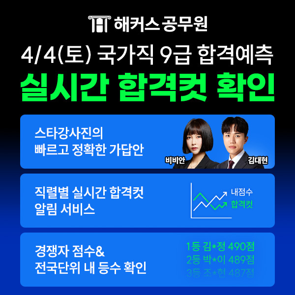 해커스공무원이 오늘(4일) 시행된 국가직 9급 공무원 시험 직후 성적 확인과 합격 가능성 판단을 위한 채점 서비스를 운영한다고 밝혔다.