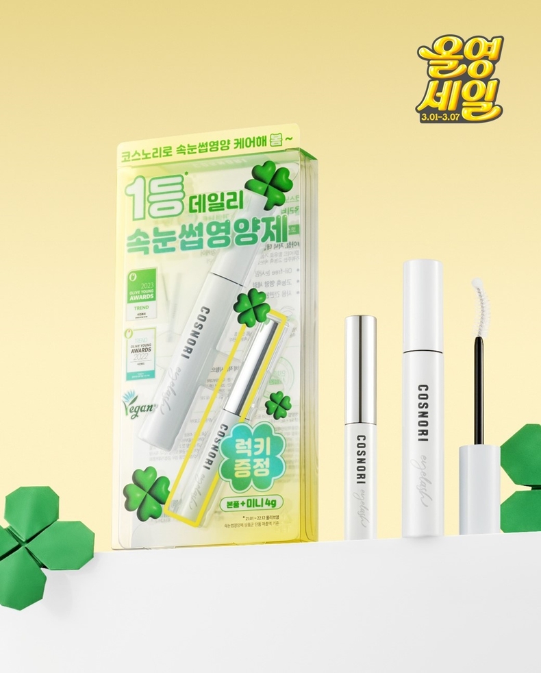 코스노리 롱 액티브 아이래쉬 세럼은 공신력 있는 뷰티어워즈에서 28 관왕을 수상한 제품이다. 최근 자연스러운 메이크업 트렌드인 “노마스카라 메이크업”이 주목받으면서, 마스카라 대신 사용할 수 있는 데일리 속눈썹 관리템으로 코스노리 속눈썹영양제가 꾸준한 인기를 얻고 있다. 해당 제품은 눈물과 유사한 pH 와 유분감 없는 워터 베이스 포뮬러로 눈시림 없이 편안하게 사용할 수 있어, 예민한 눈가에도 부담이 없다. 또한, 탄력과 윤기를 부여해주는 펩타이드 특허 성분과 히알루론산이 함유돼 속눈썹을 더욱 튼튼하고 풍성하게 관리할 수 있도록 돕는다. 이번 올영세일에서 선보이는 기획세트는 언제 어디서든 간편하게 속눈썹 케어가 가능하도록 미니 사이즈(4g)를 함께 구성했다.