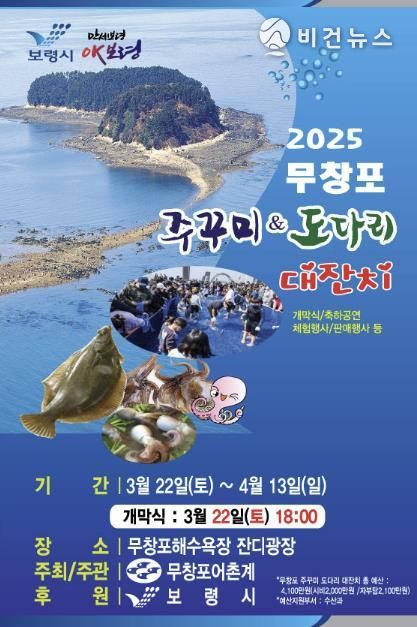 [비건뉴스=최지영 수습기자] 보령의 대표 수산물 축제인‘2025 무창포 주꾸미·도다리 대잔치’가 제22회째를 맞아 3월 22일 개막식을 시작으로 4월 13일까지 23일간 무창포해수욕장 일원에서 펼쳐진다.