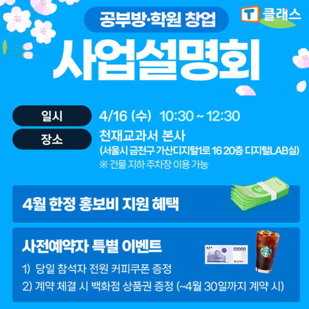 또한 4월 사업설명회에는 ‘설명회 참석 특별 혜택’도 준비돼 있다. 사전 예약 후 상담 완료 시 모바일 커피 쿠폰을 전원 증정하며 상담 진행 후 공부방·학원 개설 완료 시 100% 전원 신세계 상품권 5만 원을 추가 증정한다.