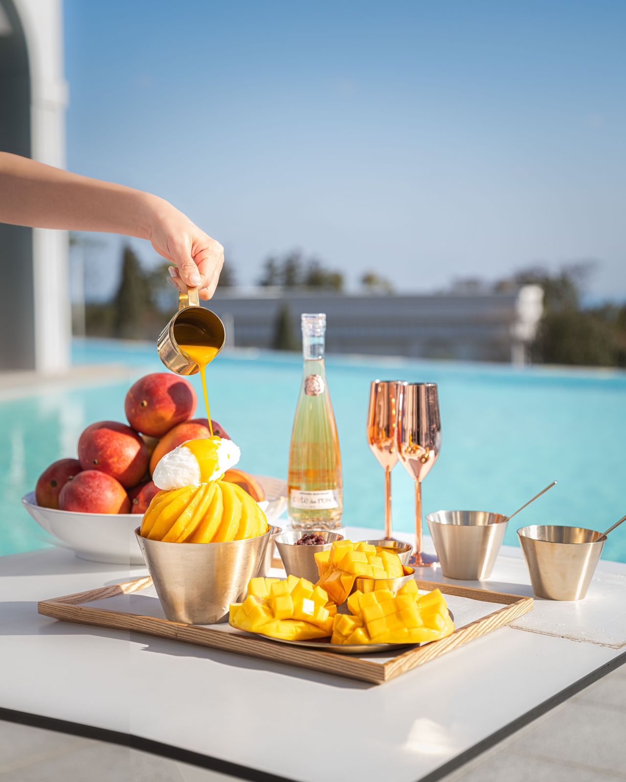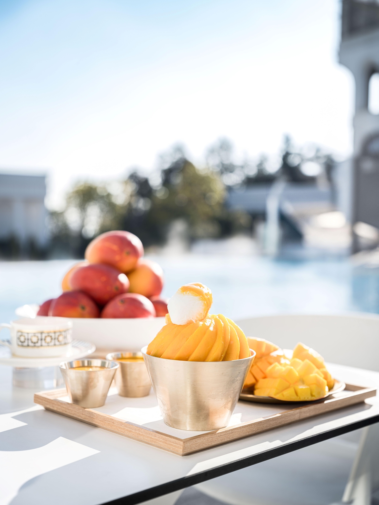 하늘과 바다가 맞닿은 이국적인 뷰를 감상할 수 있는 에메랄드 빛 인피니티 온수풀을 배경으로, 활기를 더해주는 애플망고 빙수의 선명한 컬러가 어우러져 인생 샷을 남길 수 있다.