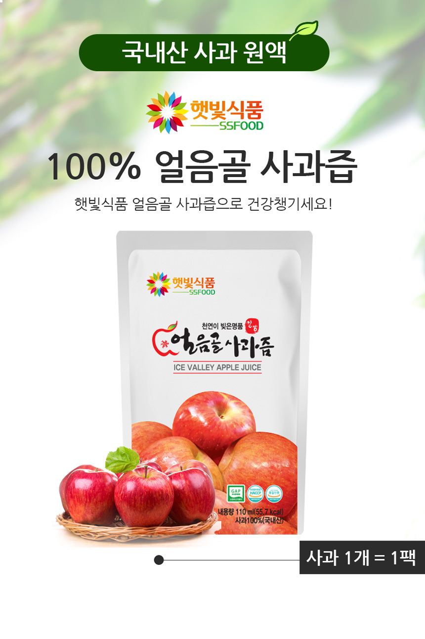 햇빛식품의 얼음골사과즙은 첨가물 없이 100% 사과만 착즙한 NFC 공법(NFC 착즙방식)으로 생산되며, HACCP 인증과 어린이 기호식품 품질인증, GAP(우수농산물관리) 인증을 모두 획득한 안전한 제품이다.
