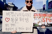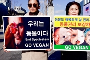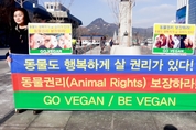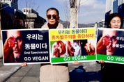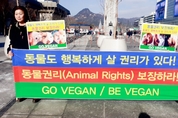 [비건뉴스=최유리 기자] 국제 동물권리의 날을 맞아 한국동물보호연합, 한국비건채식협회, 기후위기비건연대, 한국비건연대, 비건세상을위한시민모임이 12월 9일 서울 광화문 이순신 동상 앞에서 공동 기자회견을 열고 동물권 보장과 비건 실천을 촉구했다. 참가자들은 동물이 음식·실험·모피·오락·전시의 수단으로 이용되는 현실을 비판하며 종차별적 관행을 중단해야 한다고 요구했다. 현장에는 고통을 회피할 권리와 삶의 주체로서의 동물권을 강조하는 피켓과 퍼포먼스가 이어지며 시민들의 관심을 모았다.