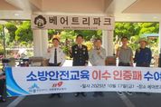 [비건뉴스=최지영 수습기자] 세종북부소방서가 17일 전동면에 위치한 베어트리파크를 ‘소방안전교육 우수 인증공원’으로 선정하고 인증패를 수여했다. 이날 행사에는 김전수 세종북부소방서장, 이선용 베어트리파크 회장 등 양 기관 관계자 10여 명이 참석해 환영 인사와 인증패 전달, 기념 촬영 등을 진행했다. 또한, 세종북부소방서는 베어트리파크 소방시설과 주요 시설을 점검하고, 소방안전 관리 개선 및 상호 협력 방안을 논의했다. 소방안전교육 우수 인증공원은 시민과 밀접한 기관·단체의 소방안전 역량을 강화하기 위해 추진 중인 ‘소방안전교육 인증제’의 일환이다. 베어트리파크는 전 직원 90% 이상이 심폐소생술(CPR), 자동심장충격기(AED) 사용법, 화재 대피 등 법정 수준의 응급처치 및 맞춤형 소방안전 교육을 이수해 높은 안전 수준을 인정받았다. 김전수 세종북부소방서장은 “베어트리파크의 적극적인 노력은 다른 기관의 모범이 될 것”이라며 “이번 인증을 계기로 안전 문화가 세종 전역으로 확산되길 기대한다”고 말했다