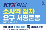 [비건뉴스=최지영 수습기자] 부천시는 서해선 KTX-이음 열차의 소사역 정차를 추진하기 위해 10만 서명운동을 시작했다. 이번 서명운동은 12월 19일까지 진행되며, 관내 시민과 인천·서울 서남권 주민의 광역철도 접근성을 높이고, 지역 산업과 관광 활성화를 통한 경제적 효과를 목표로 추진된다. 온라인 서명운동은 큐알(QR)코드와 부천시 홈페이지를 통해 참여할 수 있다. 오프라인 서명운동은 시청과 원미구·소사구·오정구청, 각 동 행정복지센터 민원실을 비롯해 소사역, 부천시청역 등 주요 전철역과 아파트 단지 등 시민 접근이 쉬운 장소에서 진행된다. 이와 함께 시는 이번 서명운동에 시민과 지역 단체, 학교 등 다양한 주체가 참여할 수 있도록 적극적인 홍보활동도 병행할 계획이다. 특히‘서해선 KTX-이음 소사역 정차’의 필요성과 지역 발전 효과를 널리 알리기 위해 소셜네트워크서비스(SNS), 지역 축제 현장 캠페인 등을 통해 적극적으로 홍보할 예정이다. 조용익 부천시장은 “KTX-이음 소사역 정차는 단순한 교통 개선을 넘어, 서해선 시대에 부천이 수도권 서남부의 중심으로 도약할 수 있는 계기”라며 “시민의
