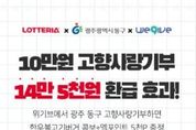 [비건뉴스=최지영 수습기자] 광주 동구는 고향사랑기부제 활성화를 위해 민간 플랫폼 위기브·롯데멤버스·롯데리아와 협력해 특별 기부 이벤트를 진행한다고 밝혔다. 이번 이벤트는 기부자가 보다 쉽고 매력적인 혜택 속에서 고향사랑기부에 참여할 수 있도록 마련된 것으로, 특히 롯데멤버스(엘포인트)·롯데리아와 제휴를 통해 실질적인 혜택을 제공함으로써 지역경제와 기부 문화 확산에 기여하고자 마련됐다. 이번 행사는 이달 27일부터 오는 12월 31일까지 진행된다. 엘포인트 앱을 통해 ‘광주동구&위기브 이벤트’ 누리집에 접속해 광주 동구에 10만 원 이상 기부하면 자동 참여된다. 광주 동구에 10만 원을 기부한 참여자는 ▲10만 원 연말정산 100% 세액공제 ▲광주 동구 답례품(기부액의 30% 한도) 제공 외에도, 롯데리아 ‘한우 불고기 버거 콤보’ 쿠폰 1매와 엘포인트 5천 포인트를 추가로 받을 수 있다. 기부자가 실제로 받을 수 있는 전체 혜택 규모는 14만 5천 원 상당으로, 쿠폰과 엘포인트는 매주 목요일 순차적으로 발송될 예정이다. 임택 동구청장은 “광주 동구 고향사랑기부제에 꾸준히 관심을 가져주시는 분들께