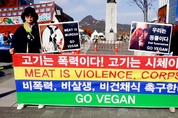 [비건뉴스=최유리 기자] 11일 오후 서울 광화문 이순신 동상 앞에서 한국동물보호연합, 한국비건채식협회, 기후위기비상행동, 비건세상을위한시민모임, 한국채식연합 등 비건 시민단체들이 ‘고기는 폭력이고 시체이다!’를 주제로 기자회견을 열었다. 참가자들은 ‘동물억압 중단하라’, ‘Meat is Murder’, ‘Go Vegan!’ 등의 구호를 외치며 피켓과 퍼포먼스로 동물 학대와 착취의 중단, 비건 채식 실천을 촉구했다.