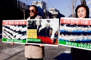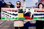 [비건뉴스=최유리 기자] 지난 9일 오후 서울 광화문 이순신동상 앞에서 한국동물보호연합, 동물에게자비를, 한국비건채식협회, 기후위기비건연대, 한국채식연합 등이 공동 기자회견을 열고 모피와 다운 등 동물성 패션 소비 중단을 촉구했다. 참가 단체들은 퍼포먼스와 피켓팅을 진행하며 모피 농장과 다운 채취 과정에서 반복되는 동물학대 실태를 알리고, 동물을 해치지 않는 비건 패션 선택을 시민들에게 호소했다.