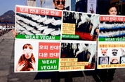 [비건뉴스=최유리 기자] 지난 9일 오후 서울 광화문 이순신동상 앞에서 한국동물보호연합, 동물에게자비를, 한국비건채식협회, 기후위기비건연대, 한국채식연합 등이 공동으로 모피와 다운 등 동물성 패션 산업의 잔혹한 실태를 고발하며 비건 대체재 사용을 촉구하는 기자회견을 개최했다. 현장에서는 성명서 낭독과 피켓팅, 퍼포먼스가 진행되며 동물 털을 패션 재료로 사용하는 관행을 중단해야 한다는 요구가 제기됐다. 한국동물보호연합 관계자는 세계적으로 매년 1억 마리 이상 야생동물이 모피 생산으로 희생되고 있으며, 약 20퍼센트는 덫이나 올무에 걸려 자연에서 고통 속에 죽고, 나머지 80퍼센트는 모피 농장에서 평생 학대와 착취 끝에 목숨을 잃고 있다고 설명했다. 그는 최근 코트와 점퍼에 부착되는 라쿤 털과 퍼 트림 등 장식용 모피 수요 증가가 문제를 더욱 심화시키고 있다고 말했다. 또한 국내 유통 모피의 다수가 중국산으로 알려져 있으며, 일부 중국 모피 농가에서는 사체가 굳어 품질이 떨어지는 것을 막기 위해 살아 있는 동물을 산채로 껍질 벗기는 방식이 여전히 사용되고 있다는 점도 지적됐다. 개와 고양이 등 반려동물까지 모피 생산에 이용되고, 이 모피가 국내에 제약 없이 수입
