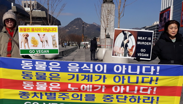 이 기사는 지난 27일 서울 광화문 이순신동상 앞에서 열린 기자회견 성명서 전문을 그대로 옮긴 것이다. 아래는 기자회견 성명서 전문이다. 비폭력 비건 채식을 실천하자. 비살생 비건 채식을 실천하자. 사랑의 비건 채식을 실천하자. 자비의 비건 채식을 실천하자. 평화의 비건 채식을 실천하자. 자유의 비건 채식을 실천하자. 연민의 비건 채식을 실천하자. 배려의 비건 채식을 실천하자. 공존의 비건 채식을 실천하자. 상생의 비건 채식을 실천하자. 비건 채식은 정답이다. 비건 채식은 필수이다. 비건 채식을 함께하자. 비건 채식을 실천하자. 비건 채식을 촉구한다. 종차별주의에 반대한다. 비거니즘을 촉구한다. GO VEGAN. BE VEGAN. 오늘날 우리의 지구는 끊임없는 폭력과 살생으로 신음하고 있다. 우리는 인간과 동물에 대한 모든 폭력과 살생을 반대하며 중단할 것을 촉구한다. 그리고 우리 인간도 동물이다. 모든 동물은 고통을 느낀다. 동물은 고통 없이 행복하게 살 권리가 있다. 하지만 인간은 동물을 물건이나 음식으로만 취급해 왔다. 실제로 인간의 식탁에 오르기 위해 매년 수많은 육지동물과 바다동물이 죽어가고 있다. 뿐만 아니라 오늘날 공장식 축산이라는 거대한 동물