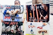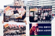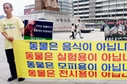 [비건뉴스=서인홍 기자] 3일 서울 광화문 세종대왕상 앞에서 한국동물보호연합 회원들이 세계 동물의 날 기자회견을 열고 현수막과 피켓을 들고 있다. (사진=한국동물보호연합 제공)