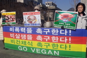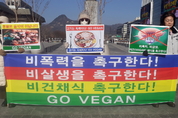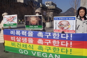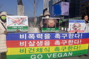 [비건뉴스=이지현 동물복지전문기자] 지난 27일 오후 1시 서울 광화문 이순신동상 앞에서 동물·비건 단체가 비폭력과 비살생을 핵심 가치로 한 비건 채식 실천을 촉구하는 기자회견을 열었다. 이날 기자회견은 한국동물보호연합을 대표 단체로 진행됐다. 이날 서울은 영하권 기온을 기록한 가운데, 참가자들은 두꺼운 외투와 장갑을 착용한 채 기자회견을 이어갔다. 기자회견은 성명서 낭독과 피켓팅, 퍼포먼스 순으로 진행됐다. 참가자들은 비폭력과 비살생, 사랑과 자비, 평화와 자유, 연민과 배려, 공존과 상생의 가치가 비건 채식 실천으로 이어져야 한다는 구호를 외쳤다. 비건 채식이 필수적 선택이라는 점을 강조하며, 종차별주의에 반대하고 비거니즘 확산을 촉구하는 문구를 현수막과 피켓에 담았다. 단체는 성명을 통해 오늘날 지구가 인간과 동물을 대상으로 한 폭력과 살생으로 고통받고 있다고 주장했다. 인간 역시 동물이며, 모든 동물은 고통을 느끼고 고통 없이 살아갈 권리가 있지만, 인간 사회는 동물을 물건이나 음식으로 취급해 왔다고 지적했다. 이어 인간의 식탁을 위해 매년 수많은 육지동물과 바다동물이 희생되고 있으며, 공장식 축산이 동물에 대한 억압과 착취를 구조화한 산업이라고 문제
