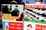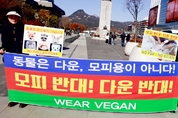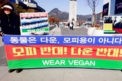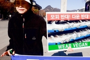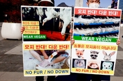 [비건뉴스=최유리 기자] 광화문 이순신동상 앞에서 열린 동물보호단체들의 기자회견에서 참가자들은 모피와 다운 생산 과정에서 발생하는 동물학대 문제를 알리며 비건 제품 선택을 촉구했다. 이번 기자회견에는 한국동물보호연합, 기후위기비건행동, 한국비건채식협회, 비건세상을위한시민모임, 한국채식연합 등이 함께했다. 이날 현장에서는 성명서 낭독과 피켓 시위, 퍼포먼스가 이어졌으며, 참가자들은 ‘모피는 싫어요’, ‘다운은 싫어요’, ‘동물털은 싫어요’, ‘비건을 입으세요’ 등 구호를 통해 동물성 의류 소비 중단을 호소했다. 한국동물보호연합 관계자는 모피 산업에 대해 일부 국제 동물단체들은 매년 전세계적으로 1억 마리 이상의 야생동물이 모피용으로 희생되는 것으로 추정한다고 밝혔다. 관계자는 또한 상당수 동물이 덫이나 올무에 갇혀 부상과 고통 끝에 죽음을 맞는 것으로 알려져 있으며, 모피 농장에 갇힌 야생동물들은 자연적 습성 박탈과 스트레스 속에서 정형행동이나 자해, 동족 포식과 같은 비정상적 행동을 보인다고 설명했다. 관계자는 중국산 모피가 국내 유통량의 많은 비중을 차지하는 것으로 파악되고 있으며, 일부 해외 동물단체들이 공개한 조사 자료에 따르면 중국 모피 농가에서 잔혹