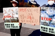 [비건뉴스=최유리 기자] 4일 오후 서울시청 정문 앞에서 한국동물보호연합, 동물의목소리, 동물에게자비를, 동물을위한전진, 카톡동물활동가 등 5개 동물보호단체가 재개발 지역에서 반복되는 길고양이 피해를 막기 위한 기자회견을 열었다. 참가자들은 “재개발 길고양이 생매장을 중단하라”, “우리도 살고 싶다”는 피켓을 들고 생존권 보장과 안전이소 대책 마련을 촉구했다.