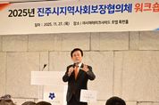 [비건뉴스=최지영 수습기자] 진주시는 27일 지역사회보장협의체 읍면동 위원 100여 명이 참석한 가운데 아시아레이크사이드호텔에서 ‘2025 지역사회보장협의체 워크숍’을 개최했다. 이번 행사는 복지 사각지대 발굴과 지역주민들의 사회보장 증진을 위해 활동하고 있는 읍면동 협의체 위원들의 역량 강화와 사기진작을 목적으로 마련됐다. 이날 워크숍에서는 읍면동별 협의체의 활동 성과를 공유하고 변화하는 복지 환경에 빠르게 대응할 수 있는 지역복지 주체로서의 역할을 재정립하며, 협의체 활성화 방안을 함께 모색했다. 아울러 ‘협의체 회원을 위한 힐링’을 주제로 조정호 강사의 특강이 진행돼 위원들이 재충전하고 소통하는 뜻깊은 시간이 됐다. 진주시협의체 김병윤 위원장은 “읍면동에서 지역민들의 복지증진을 위해 애쓰고 계신 위원님들께 감사드리며, 오늘 자리가 위원님들 상호교류의 장이자 좋은 정보를 공유할 수 있는 뜻깊은 시간이 되기를 바란다”고 말했다. 조규일 진주시장은 “따뜻한 마음과 봉사로써 우리 사회의 그늘지고 불편한 곳을 보듬으며 복지 지킴이 역할을 다하고 계신 위원님들의 노고에 감사드린다”면서 “진주시도 다양한
