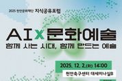 [비건뉴스=최지영 수습기자] 천안문화재단은 내달 2일 천안축구센터에서 ‘2025 천안문화재단 지식공유포럼’을 개최한다고 6일 밝혔다. 이번 포럼은 ‘AI✕문화예술 : 함께 사는 시대, 함께 만드는 예술’을 주제로 인공지능(AI)의 급속한 발전이 우리의 삶과 문화예술에 미치는 영향을 살펴보고, 변화하는 환경 속에서 예술의 새로운 방향을 모색하기 위해 마련됐다. 포럼 1부에서는 김윤경 한국문화관광연구원 부연구위원이 ‘AI시대 문화예술계 변화와 현장 대응 전략’을, 김지현 중부대학교 사진영상학과 교수가 ‘예술가의 AI 창작 실험 및 제작 사례’를 주제로 발제한다. 이어 2부에서는 허대찬 미디어문화예술채널 앨리스온 편집장과 이지용 단국대학교 글로벌 K-컬처 인문사회융합인재단 교수, 최수웅 단국대학교 문예창작과 교수가 참여해 ‘AI와 예술의 공존’에 대해 토론을 진행할 예정이다. 이번 포럼을 통해 AI 시대의 예술 창작과 유통·향유 방식의 변화를 살피고, 지역 문화생태계의 미래 방향을 고민하는 자리가 될 것으로 기대하고 있다. 포럼은 무료로 진행되며, 참가를 희망하는 시민은 재단 누리집 또는 네
