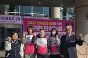[비건뉴스=최지영 수습기자] 전라남도의회 박형대 의원(진보당·장흥1)은 11월 5일 전라남도교육청 앞을 찾아 학교비정규직 단체교섭 조속 타결을 요구하며 13일째 노숙 단식농성을 이어가고 있는 노동조합 간부들을 위로했다. 전남학교비정규직연대회의와 전라남도교육청은 2024년 3월 본교섭을 시작으로 2년째 121차에 이르는 단체교섭을 진행했으나, 여전히 합의점을 찾지 못한 채 난항을 겪고 있다. 노동조합은 단체교섭을 통해 정규직과 비정규직 간 복무·복지 차별 해소를 요구하고 있으나, 도교육청은 예산 등의 이유로 대부분 수용이 어렵다는 입장을 고수하고 있다. 주요 쟁점은 ▲공무원 65일에 비해 공무직은 15일로 제한된 장기재직휴가, ▲공무원 최대 165만 원에 비해 공무직은 65만원 수준인 맞춤형복지비, ▲유급병가일수 60일 대 30일의 격차, ▲예산 소요가 없음에도 불구하고 불허된 방학 중 직무연수 등이다. 전국학교비정규직노조 전남지부 황호순 지부장은 “단체교섭 타결을 촉구하며 단식 13일차에 돌입했으나, 교육감이 직접 해결의지를 보이지 않고 있다”며 “원한만 해결이 어려울 시 14일 총파업에 나설 수밖