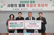 [비건뉴스=최지영 수습기자] 예천군은 26일 오전, 경북사회복지공동모금회(회장 전우헌)가 주최하는 ‘2025 경상북도 찾아가는 이웃돕기 유공자 포상식’이 예천군청에서 열렸다고 밝혔다. 이번 행사는 희망 2025 나눔캠페인과 나눔 및 선행문화 확산에 기여한 개인 및 나눔봉사단의 공로를 기리고 격려하기 위해 마련됐다. 이날 행사에서 나눔·봉사를 실천한 공로로 사회복지공동모금회장 표창에 학가산 전통메주마을 박상지 대표, 기부와 선행을 실천한 공로로 경북도지사표창에 해인종합상사 황지훈 대표, 최우수 봉사단에 예천군 사랑의열매 나눔봉사단이 선정됐다. 아울러 봉사단 활동에 활발히 참여해 준 김종순 사무국장과 박승용 단원에 사회복지공동모금회장 표창을 수여했다. 예천군 사랑의열매 나눔봉사단은 ‘희망2025나눔캠페인’에서 약 5억 8천만 원의 이웃돕기 성금을 모금했으며, 착한가게 영입, 나눔리더 발굴 등 따뜻한 나눔문화 확산에 앞장선 결과 2년 연속 최우수 봉사단으로 선정될 수 있었다. 경북사회복지공동모금회 손병일 사무처장은 “한해 동안 열심히 활동 해 주신 예천군 사랑의 열매 나눔봉사단에 감사드리며, 내년에도