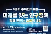 [비건뉴스=최지영 수습기자] 충북도는 24일, 한국교원대학교 청람아트홀에서 ‘미래를 잇는 인구정책, 함께 만드는 충북의 내일’을 주제로'제5회 충북인구포럼'을 개최했다고 밝혔다. 올해로 5번째를 맞는 충북인구포럼은 저출생·고령화 심화로 인구감소 가속화 등 인구위기에 따른 대응 전략을 충청북도, 충청북도교육청, 한국교원대학교가 함께 모색하기 위해 마련됐다. 이번 포럼에는 김영환 충청북도지사, 차우규 한국교원대학교 총장, 김태형 충청북도교육청 부교육감, 노금식 충청북도의회 인구소멸대응 대책 특별위원회 위원장을 비롯해 도·시군 및 교육 관계자, 연구자, 도민 등 200여 명이 참석했다. 충북은 2025년 상반기 출생아 수 증가율 12.8%로 전국 1위를 기록하는 등, 전국적 저출생 심화 속에서도 상승 추세를 이어가고 있다. 이에 충북도는 결혼·출산 친화환경 조성과 출산·양육 지원정책 강화는 물론, 교육·지역 활성화 정책과 연계한 중장기 인구정책 패러다임 전환을 추진하고 있다. 이번 포럼에서는 이러한 정책 방향을 뒷받침하는 연구 결과를 공유하는 다양한 발제와 토론이 진행됐다. 첫 번째 발표에