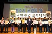 [비건뉴스=최지영 수습기자] 100세 시대를 맞아 전주지역 노인들의 행복하고 건강한 노후생활을 함께 염원하는 노인의날 기념식이 열렸다. 전주시와 대한노인회 전주시지회(지회장 홍성언)는 14일 전주학생교육문화관 공연장에서 우범기 전주시장과 최주만 전주시의회 부의장, 김두봉 대한노인회 전북특별자치도연합회장, 표창 수상자 등 1200여 명이 참석한 가운데 ‘제29회 전주시 노인의날 기념식’을 가졌다. 송민주 대한노인회 전주시지회 사무국장의 사회로 진행된 이날 기념식은 △무지개예술자원봉사단(단장 고대현)과 아름다운 실버 전주의꽃(단장 김인식)의 식전 공연 △노인 강령 낭독 △청려장(장수지팡이) 수여 △전주시장 및 전주시의장 표창 수여식 △노인복지공로자에 대한 공로장 수여식 등의 순으로 진행됐다. 특히 우범기 전주시장은 이날 기념식에서 올해 100세를 맞이한 김옥순 어르신(여, 덕진동)에게 무병장수의 상징인 청려지팡이를 전달했으며, 홍성언 지회장은 축하의 꽃다발을 선물했다. 홍성언 대한노인회 전주시지회장은 “풍성했던 한가위도 지나가고, 땀과 노력으로 이뤄낸 결실의 계절 가을을 맞이해 참석해 주신 우범기 전