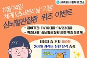 [비건뉴스=최지영 수습기자] 서귀포시 동부보건소는 2025년 ‘세계 당뇨병의 날’을 기념하여 11월 10일부터 11월 23일까지 14일간 모바일 앱 ‘워크온’을 활용한 심뇌혈관질환 퀴즈 이벤트를 운영한다. 이번 퀴즈 이벤트는 지역 주민들에게 고혈압, 당뇨병 등 선행질환을 포함한 심뇌혈관질환에 대한 올바른 정보제공과 건강생활실천 습관을 독려하기 위해 마련됐으며, 서귀포시 동부 지역 주민이라면 모바일 걷기 앱인 ‘워크온(WalkOn)’을 통해 쉽게 참여할 수 있다. 참여 방법은 ‘워크온(WalkOn)’ 앱 내 서귀포시 동부보건소 ‘하영걸을락’ 커뮤니티에 가입한 후, 심뇌혈관질환 퀴즈 5문제를 다 풀고 응모하기 버튼을 누르면 된다. 퀴즈 참여 정답자 중 추첨을 통해서 100명에게는 소정의 기념품도 제공된다. 서귀포시 동부보건소 관계자는 “이번 이벤트로 지역 주민들이 자기 혈관 수치에 관심을 갖고, 스스로 건강관리 계기를 마련했으면 좋겠다”라고 말하며, “많은 사람들이 참여하여 심뇌혈관질환 예방 실천의 중요성을 알고, 더 나아가 주변에 알릴 수 있기를 바란다”라고 했다.