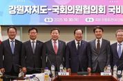 [비건뉴스=최지영 수습기자] 김진태 강원특별자치도지사는 10월 30일 오후 2시, 국회 의원회관에서 도내 지역구 국회의원 7명과 함께 도 국회의원협의회를 열고 2026년도 국비 추가 확보 방안 등을 논의했다. 이번 간담회는 2026년도 정부예산안의 국회 심의가 본격화되는 시점에 맞춰 도와 지역 국회의원 간 협력체계를 강화하기 위해 마련된 자리로, 김 지사를 비롯해 지역구 국회의원 보좌진이 참석해 예산 확보 전략을 중심으로 실무적인 논의를 진행했다. 이 자리에서 도는 올해 국비 10조 원 시대를 처음으로 연 성과를 바탕으로 정부 예산안에 미반영된 24개 사업(총 612억 원)의 국비 추가 확보 방안을 논의하고, 해당 사업들이 국회 심의 과정에서 반드시 반영될 수 있도록 국회의 적극적인 협력을 요청했다. 이와 함께 ▲용문~홍천 광역철도 예타 통과 ▲삼척~강릉 고속화철도 예타 통과 ▲포천~철원 고속도로 예타 통과 ▲소양8교 건설 국비 반영 ▲제5차 국가철도망 구축계획 및 제6차 국도‧국지도 건설계획 최대 반영 등 강원지역 주요 에스오시(SOC) 현안과제에 대해서도 폭넓은 논의가 이뤄졌다. 한기호 국회의원