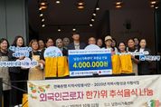 [비건뉴스=최지영 수습기자] 남원시가족센터는 지난 10월 2일 고유 명절인 추석을 맞이하여 관내 외국인근로자를 대상으로 음식나눔 행사를 실시했다. 이번 외국인근로자 추석음식 나눔은 JB금융그룹 전북은행 지역사랑성금 400만원을 지원받아 진행됐다. 남원시가족센터에서는 2016년부터 외국인 근로자를 대상으로 한국어 교육을 실시해 왔으며, 현재는 8개반 37명이 한국어 교육 서비스를 받고 있다. 또한 남원시가족센터는 외국인지원센터를 운영하여 증가하는 외국인 주민들의 안정적인 정착을 돕고, 지역사회의 일원으로서 통합을 지원하기 위한 다양한 체류 지원 서비스를 제공하고 있다. 이번 명절 한가위 음식나눔 꾸러미는 찰밥, 산적, 떡, 과일, 생활용품으로 구성되어 있으며, 다양한 국가(캄보디아, 미얀마, 네팔, 스리랑카, 방글라데시 등)의 근로자 70명에게 전달됐다. 나찬도 센터장은 “다문화가족과 지역민, 그리고 센터가 삼위일체가 되어 서로 소통하고 이주민들의 한국 사회정착을 적극적으로 지원하고 함께하는 센터가 되도록 적극적으로 수행해 나가겠다”라고 소감을 밝혔다. 여성가족과 김미옥과장은