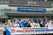 [비건뉴스=최지영 수습기자] 경주시 미래발전자문위원회는 21일 경주역 일대에서 2025 APEC 정상회의의 성공개최를 기원하는 시민참여 캠페인을 실시했다. 이번 캠페인은 청결하고 친절한 도시 이미지를 세계에 알리고 ‘살기 좋은 글로벌 도시, 경주’의 위상을 확산하기 위해 마련됐다. 이날 위원들은 APEC 홍보물을 시민과 관광객에게 배포하며 정상회의 개최 의의와 경주의 역할을 알렸고, 경주역 주변 및 광장 일대에서 쓰레기 수거와 환경정비 활동을 펼쳐 쾌적한 도시환경 조성에 앞장섰다. 또한 택시 기사와 상가 상인들을 대상으로 ‘미소와 인사’ 친절 캠페인을 진행하며 경주의 따뜻하고 밝은 이미지를 널리 전파했다. 이와 함께 APEC 홍보 및 친절문화 확산 카드뉴스를 시민들에게 배포해 자발적인 참여 분위기를 이끌었다. 참여자들은 “시민 한 사람의 참여가 APEC 성공의 열쇠이자, 경주의 글로벌 위상을 높이는 힘이 된다”라며, “깨끗한 환경과 친절한 미소로 세계 손님을 맞이하자”고 동참을 당부했다.