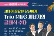 [비건뉴스=최지영 수습기자] 화순군은 '2025 군민행복 아카데미의 마지막 10회차 강연을 오는 12월 10일 오후 3시에 화순군청 4층 대회의실에서 개최한다고 밝혔다. 이번 강연은 클래식 연주단체 Trio MEG를 초청해 ‘사랑이 필요한 당신에게 – Trio MEG 세 남자의 클래식 수다’를 주제로 진행된다. 피아노(김용진)·바이올린(오현)·첼로(윤여훈)의 실내악 연주와 해설을 곁들인 클래식 토크 콘서트 형식으로, 누구나 공감할 수 있는 ‘사랑’을 테마로 재해석한 명곡을 군민들에게 들려줄 예정이다. Trio MEG는 2017년 창단한 클래식 전문 연주단체로 ‘Music makes Everything Grow(음악은 모든 것을 성장시킨다)’를 슬로건으로 활동하고 있다. 50여 곡의 명곡을 재창작해 발표했으며, 전국 문화재단 · 교육기관 · 지자체 · 기업 등에서 활발한 공연 활동을 이어오고 있다. 또한 KBS 클래식FM, TBS 교통방송, 한경ARTE TV 등에도 다수 출연했다. 조미화 화순군 인구청년정책과장은 “2025년 한 해 동안 군민행복 아카데미에 함께해 주신 군민