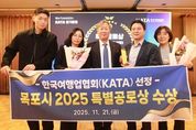 [비건뉴스=최지영 수습기자] 목포시가 한국여행업협회(KATA)가 선정한 ‘2025 KATA 특별공로상’을 수상했다. 한국여행업협회는 국내‧외 인바운드·아웃바운드 여행사 3,000여 개와 관광업계, 항공사 등 100여 개 유관기관이 참여하는 단체로, 문체부와 함께 국내외 관광 활성화와 관광산업 발전을 위한 다양한 사업을 추진하고 있다. 협회는 지난 11월 21일 서울 롯데호텔에서 열린 2025 KATA 정기총회에서 전국 지자체 중 유일하게 목포시에 특별공로상을 수여했다. 이번 수상은 대한민국 관광거점도시인 목포시가 문체부 및 KATA와 함께 지난 6월 ‘제38차 한·대만 관광교류회의’를 성공적으로 개최하고, 국내·외 관광객 유치를 위한 다양한 세일즈마케팅에 적극 협력한 공로를 높이 평가한 결과다. 전국 3,000여 여행업계 대표들의 감사와 지지로 신설된 상이라는 점에서 의미가 더욱 크다. 지난해 ‘대한민국 여행하기 가장 좋은 도시’, ‘2025 미식관광도시’ 등 대표 브랜드 대상을 수상한 목포시는 올해 국제남도미식산업박람회 등 주요 국제행사를 통해 글로벌 관광거점도시로서의 경쟁력을 강화해