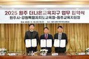 [비건뉴스=최지영 수습기자] 원주시는 지난 18일 시청 7층 투자상담실에서 ‘원주 더나은교육지구’ 지정 연장 업무협약을 체결했다. 협약식에는 원강수 원주시장, 신경호 강원특별자치도 교육감, 김성진 원주교육지원청 교육장이 참석했다. 더나은교육지구는 원주시와 강원특별자치도교육청, 원주교육지원청이 협약을 통해 구축하는, 마을과 학교가 함께하는 지역 교육공동체다. 이번 협약은 1기(2018-2021)와 2기(2022-2025)에 이어 추진되는 3기 사업으로, 2026년부터 2029년까지 4년간 운영된다. 원주시와 도 교육청이 매년 각각 2억 원씩, 총 16억 원의 사업비를 지원한다. 3기 사업 지난 사업 추진 실적을 바탕으로 새롭게 개편됐으며, ‘배움과 성장, 문화예술로 동행하는 원주’를 비전으로 4개의 추진 과제와 12개의 세부 사업으로 구성됐다. 이를 통해 지역과 학교가 함께 성장하는 교육 기반을 더욱 강화할 계획이다. 특히 3기에서는 비전에 걸맞은 다양한 문화예술 프로그램이 추진된다. 원주의 특화 산업인 한지 교육을 통해 민·관·학 협력 분위기를 조성하고, 지역 문화·관광 자원을 직접 체험할 수 있는