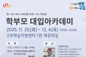 [비건뉴스=최지영 수습기자] 구로구가 예비 수험생 학부모를 대상으로 ‘2027학년도 학부모 대입 아카데미’를 운영한다. 구는 변화하는 대입 제도와 입시 환경 속에서 학부모가 정확한 정보를 이해하고, 자녀의 진로·진학을 체계적으로 지원할 수 있도록 매년 학부모 대입 아카데미를 운영하고 있다. 교육은 구로구 관내 예비 수험생(중학교 3학년∼고등학교 2학년)을 둔 학부모 50명을 대상으로 구로학습지원센터 1관 대강의실에서 진행된다. 이번 프로그램은 △11월 25일 ‘고교학점제 대비 및 2028학년도 대입 제도 분석’ △11월 27일 ‘학종 성공을 위한 과목 선택과 내신 1등급 만들기 공부 비법’ △12월 2일 ‘2027학년도 대입 전형의 이해와 수시모집 성공전략 세우기’ △12월 4일 ‘주제탐구활동을 하면 학생부가 왜 특별해 보일까?’ 등 총 4회에 걸쳐 매회 오후 7시부터 9시까지 2시간 동안 이어진다. 강의는 진학 멘토 ‘신의 한 수’ 입시전략연구소 김용택 대표가 나서 학부모가 자녀와 함께 실천할 수 있는 현실적인 진학 지도 방안과 대입 준비에 필요한 핵심 정보를 전달할 예정이다. 참여를