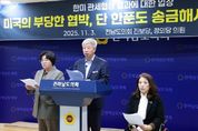[비건뉴스=최지영 수습기자] 전라남도의회 박형대의원(진보당ㆍ장흥1)은 3일 도의회 브리핑룸에서 최근 타결된 ‘10.29 한미 관세협상’에 대한 진보당, 정의당 공동 기자회견에 참석해 공동 입장을 발표했다. 이날 입장문 낭독에는 진보당 오미화ㆍ박형대 의원, 정의당 김미경 의원이 함께했다. 두 당은 입장문을 통해 “이번 한미 관세협상은 미국의 부당하고 폭압적인 요구에 굴종한 굴욕적 합의”라며 “대한민국 정부는 국민 동의 없이 막대한 현금투자를 약속하고 미국의 일방적 요구를 수용했다”고 비판했다. 정부는 지난 10월 29일 아시아태평양경제협력체(APEC) 정상회의를 계기로 미국과의 관세협상 세부 합의를 발표했다. 이번 협상에 따라 한국은 총 3,500억 달러 규모의 대미 금융투자 패키지를 구성해 이 중 2,000억 달러를 현금투자(연간 200억 달러 한도), 1,500억 달러를 조선업 협력으로 추진하기로 했다. 또한 자동차 관세는 기존 25%에서 15%로 인하되며, 반도체·의약품 등 일부 품목은 무관세 혜택을 받게 된다. 전남도의회 진보당·정의당 의원들은 “이 협상은 사실상 미국