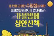 [비건뉴스=최지영 수습기자] 청주시는 2026학년도 대학수학능력시험을 치른 수험생을 대상으로 ‘가을밤에 성안산책’ 프로그램에서 특별 이벤트를 진행한다고 12일 밝혔다. 11월 성안산책 프로그램에 참여한 수험생에게 성안길상점가에서 사용할 수 있는 상품권(5천원)을 제공하는 내용으로, 2026학년도 수능 수험표를 소지한 수험생에게 적용된다. 가을밤에 성안산책은 9~11월 매주 금요일과 토요일 오후 7시부터 8시까지 한 시간 동안 청주 원도심 문화유산 5곳을 돌며 청주시 문화관광해설사의 해설을 듣는 프로그램이다. 참가 신청은 청주여기 모바일 앱을 통해 가능하며, 사전 신청한 선착순 40명에 한해 상품권이 지급될 예정이다. 한편, 가을밤에 성안산책은 오후 7시 이후 유동 인구가 급감하는 성안길과 중앙공원 일대를 활성화하기 위해 기획됐다. 지난 10일 기준 누적 참여인원은 558명을 기록, 원도심을 대표하는 신규 야간관광 체험 콘텐츠로 자리매김하고 있다. 이현숙 관광과장은 “시험을 마친 수험생들이 가을밤 정취를 마음 편히 즐기고, 올 한해 지친 마음을 치유할 수 있는 알찬 시간이 되길 바란다”며