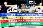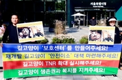[비건뉴스=최유리 기자] 4일 오후 서울시청 정문 앞에서 한국동물보호연합, 동물의목소리, 동물에게자비를, 동물을위한전진, 카톡동물활동가 등 5개 동물보호단체가 재개발 지역에서 반복되는 길고양이 피해를 막기 위한 기자회견을 열었다. 참가자들은 “재개발 길고양이 생매장을 중단하라”, “우리도 살고 싶다”는 피켓을 들고 생존권 보장과 안전이소 대책 마련을 촉구했다.