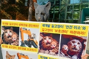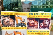 [비건뉴스=최유리 기자] 동물보호단체들이 4일 오후 서울시청 정문 앞에서 재개발 현장에서 반복되는 길고양이 피해 실태를 고발하며 생존권 보장을 촉구했다. 이번 기자회견은 한국동물보호연합, 동물의목소리, 동물에게자비를, 동물을위한전진, 카톡동물활동가 등 5개 단체가 공동으로 주최했다. 참가자들은 “재개발 길고양이 ‘생매장’을 중단하라”, “우리도 살고 싶다” 등의 문구가 적힌 피켓을 들고 재개발 지역에서 반복되는 고양이 학대·살상 행위를 즉각 중단하라고 요구했다. 이들은 성명서를 통해 “굴삭기 철거 과정에서 어미 고양이와 새끼가 함께 매몰되는 사고가 잇따르고 있다”며 “재개발 현장은 길고양이에게 지옥이나 다름없다”고 지적했다. 단체 측은 “국내에는 약 100만 마리의 길고양이가 살고 있으며, 매년 전국적으로 1만 곳이 넘는 재개발과 재건축이 진행되고 있다”며 “지자체와 시행사, 조합 등은 고양이의 생명을 보호하기 위한 안전이소와 이주방사 대책을 마련해야 한다”고 강조했다. 현행 동물보호법 제8조는 ‘동물을 산채로 매장하거나 잔인한 방법으로 죽음에 이르게 하는 행위’를 동물학대로 규정하고 있으며, 이를 위반할 경우 3년 이하 징역 또는 3000만원 이하의 벌금형