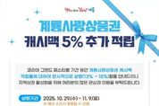 [비건뉴스=최지영 수습기자] 계룡시는 코리아 그랜드 페스티벌 기간 동안 지역 내 소비 활성화를 위해 모바일 계룡사랑상품권 사용 시 캐시백 적립률을 한시적으로 5% 추가하여 13%에서 18%로 상향한다고 밝혔다. 이번 혜택은 국가단위 할인행사인 ‘코리아 그랜드 페스티벌’ 기간에 맞춰 침체된 지역상권에 활력을 불어넣고, 시민들에게 실질적인 소비 혜택을 제공하기 위한 것으로 10월 29일부터 11월 9일까지 12일간 시행된다. 단, 예산 소진 시 5% 추가 적립은 조기 종료될 수 있다. 모바일 계룡사랑상품권은 행사 기간 동안 18% 캐시백이 적용되며, 종료 후 올해 말까지는 13% 적립률이 유지되고 구매 한도는 월 50만 원, 보유 한도는 100만 원이다. 상품권은 구글 플레이스토어 또는 앱스토어에서 ‘지역상품권 chak’ 앱을 설치한 뒤 회원가입을 통해 간편하게 구매할 수 있다. 시는 이번 캐시백 확대를 통해 시민들의 소비 참여를 유도하고, 소상공인과 영세상권의 매출 증대에 도움이 될 것으로 기대하고 있다. 이응우 계룡시장은 “코리아 그랜드 페스티벌과 연계한 이번 캐시백 혜택이
