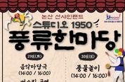 [비건뉴스=최지영 수습기자] 논산시와 논산문화관광재단(이사장 백성현)은 오는 11월 29일부터 30일까지 양일간, 선샤인랜드 1950스튜디오에서 ‘스튜디오1950 풍류 한마당’을 개최한다. 이번 행사는 전통문화 공연과 시민참여형 체험 프로그램이 어우러진 복합문화행사로, 지역민과 관광객이 함께 즐기는 소통의 장이 될 예정이다. 행사기간 동안 오후 13:00~17:00까지 다양한 프로그램이 진행되며, 메인 공연으로는 전통시장 상인들의 일상과 애환을 그린 마당극이 29일 오후 14:00와 16:00시 두 차례 펼쳐진다. 생생한 연기와 서민들의 정이 묻어나는 이야기로 구성된 이번 마당극은 관객들에게 웃음과 감동을 선사할 예정이다. 공연이 끝난 뒤에는 출연진과 관람객이 함께 참여하는 거리 코스튬 퍼레이드가 약 20~30분간 진행된다. 배우와 시민이 어우러져 선샤인랜드 1950스튜디오 거리 곳곳을 행진하며 현장 분위기를 더욱 뜨겁게 달굴 예정이다. 또한 공연 중간 시간에는 지역 가수의 버스킹 공연이 이어져 관람객이 자유롭게 음악을 즐길 수 있는 열린 문화 무대로 꾸며진다. 이와 함께 상시 운영되는 체험 프로그램도 눈길을