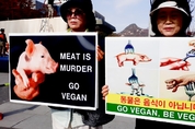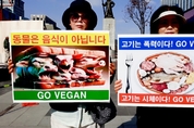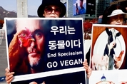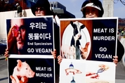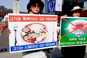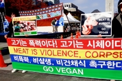 [비건뉴스=최유리 기자] 11일 오후 서울 광화문 이순신 동상 앞에서 한국동물보호연합, 한국비건채식협회, 기후위기비상행동, 비건세상을위한시민모임, 한국채식연합 등 비건 시민단체들이 ‘고기는 폭력이고 시체이다!’를 주제로 기자회견을 열었다. 참가자들은 ‘동물억압 중단하라’, ‘Meat is Murder’, ‘Go Vegan!’ 등의 구호를 외치며 피켓과 퍼포먼스로 동물 학대와 착취의 중단, 비건 채식 실천을 촉구했다.