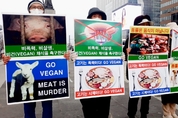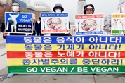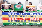 [비건뉴스=최유리 기자] 11일 오후 서울 광화문 이순신 동상 앞에서 한국동물보호연합, 한국비건채식협회, 기후위기비상행동, 비건세상을위한시민모임, 한국채식연합 등 비건 시민단체들이 ‘고기는 폭력이고 시체이다!’를 주제로 기자회견을 열었다. 참가자들은 ‘동물억압 중단하라’, ‘Meat is Murder’, ‘Go Vegan!’ 등의 구호를 외치며 피켓과 퍼포먼스로 동물 학대와 착취의 중단, 비건 채식 실천을 촉구했다.