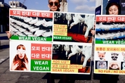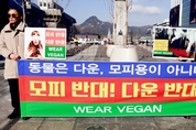 [비건뉴스=최유리 기자] 지난 9일 오후 서울 광화문 이순신동상 앞에서 한국동물보호연합, 동물에게자비를, 한국비건채식협회, 기후위기비건연대, 한국채식연합 등이 공동 기자회견을 열고 모피와 다운 등 동물성 패션 소비 중단을 촉구했다. 참가 단체들은 퍼포먼스와 피켓팅을 진행하며 모피 농장과 다운 채취 과정에서 반복되는 동물학대 실태를 알리고, 동물을 해치지 않는 비건 패션 선택을 시민들에게 호소했다.