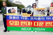 [비건뉴스=최유리 기자] 지난 9일 오후 서울 광화문 이순신동상 앞에서 한국동물보호연합, 동물에게자비를, 한국비건채식협회, 기후위기비건연대, 한국채식연합 등이 공동으로 모피와 다운 등 동물성 패션 산업의 잔혹한 실태를 고발하며 비건 대체재 사용을 촉구하는 기자회견을 개최했다. 현장에서는 성명서 낭독과 피켓팅, 퍼포먼스가 진행되며 동물 털을 패션 재료로 사용하는 관행을 중단해야 한다는 요구가 제기됐다. 한국동물보호연합 관계자는 세계적으로 매년 1억 마리 이상 야생동물이 모피 생산으로 희생되고 있으며, 약 20퍼센트는 덫이나 올무에 걸려 자연에서 고통 속에 죽고, 나머지 80퍼센트는 모피 농장에서 평생 학대와 착취 끝에 목숨을 잃고 있다고 설명했다. 그는 최근 코트와 점퍼에 부착되는 라쿤 털과 퍼 트림 등 장식용 모피 수요 증가가 문제를 더욱 심화시키고 있다고 말했다. 또한 국내 유통 모피의 다수가 중국산으로 알려져 있으며, 일부 중국 모피 농가에서는 사체가 굳어 품질이 떨어지는 것을 막기 위해 살아 있는 동물을 산채로 껍질 벗기는 방식이 여전히 사용되고 있다는 점도 지적됐다. 개와 고양이 등 반려동물까지 모피 생산에 이용되고, 이 모피가 국내에 제약 없이 수입