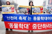 [비건뉴스=최유리 기자] 동물보호단체들이 16일 오후 서울 광화문 이순신동상 앞에서 기자회견을 열고, 매년 강원도 화천에서 열리는 산천어 축제를 ‘동물학대 축제’로 규정하며 즉각적인 중단을 촉구했다. 한국동물보호연합과 동물에게자비를, 한국비건채식협회, 기후위기비건행동, 한국비건연대, 한국채식연합은 이날 공동 기자회견을 통해 “동물을 오락과 유흥의 대상으로 삼아 고통과 죽음을 전제로 하는 축제는 결코 정당화될 수 없다”고 밝혔다. 이들 단체는 산천어 축제가 열리는 화천 지역이 산천어의 자연 서식지가 아니라는 점을 문제로 지적했다. 산천어는 수온 20도를 넘지 않는 강원 영동 지역 하천에 주로 서식하는 어종으로, 영서 지역에 위치한 화천에는 자연 서식하지 않는다는 설명이다. 그럼에도 축제를 위해 전국 양식장에서 길러진 산천어가 매년 약 80만에서 100만 마리 규모로 화천으로 운송된다고 주장했다. 단체 측은 운송 과정에서 산천어들이 과밀 상태와 산소 부족, 기온 변화 등으로 극심한 스트레스를 받거나 폐사하며, 낚시 미끼를 잘 물게 하기 위해 수일간 굶겨지는 사례도 발생한다고 밝혔다. 이후 얼음 구멍 낚시나 맨손잡기 체험 과정에서 산천어들이 반복적으로 고통을 겪고